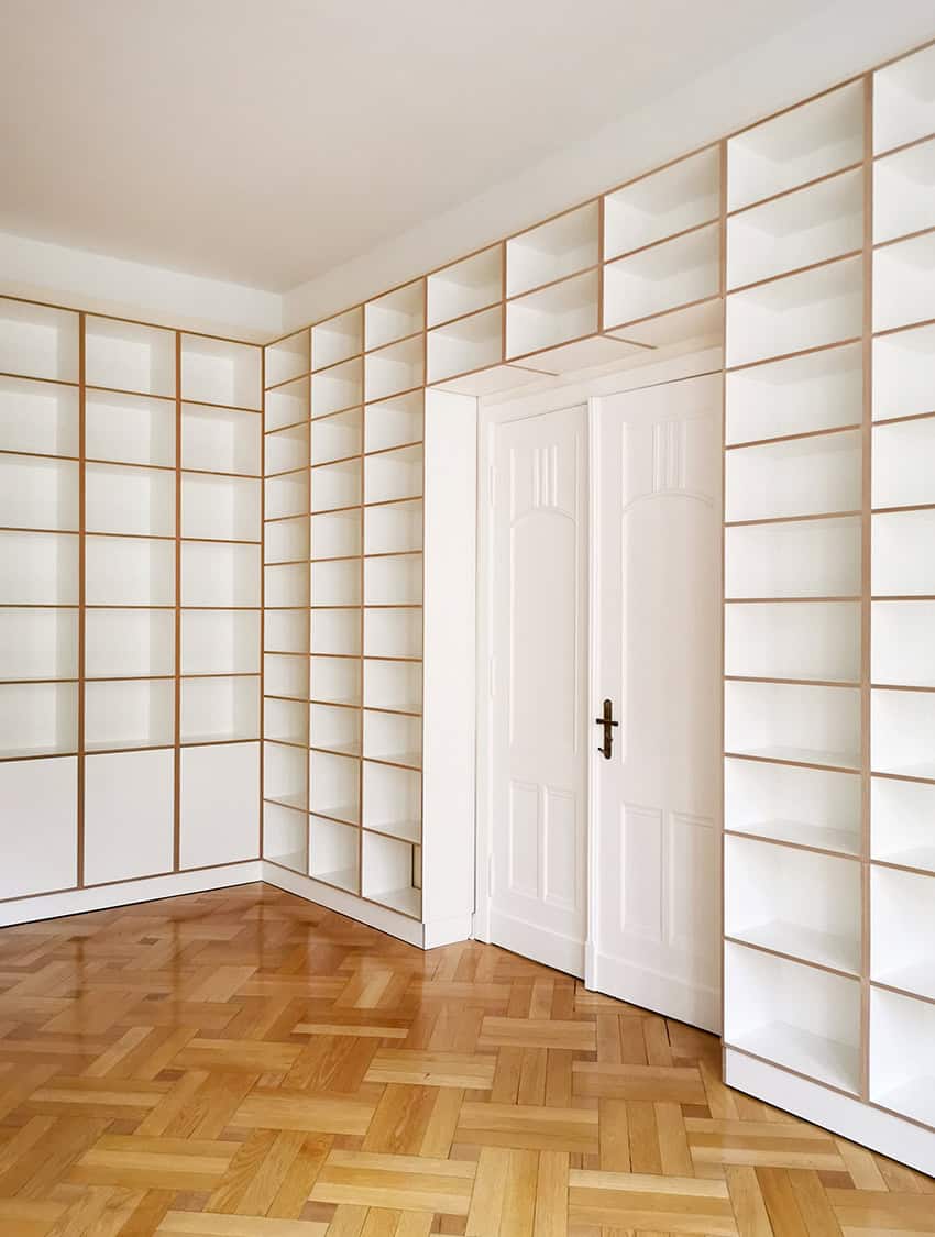 Unsere MODERN SCHMAL-Module sind 35,9 cm schmal. Beliebig viele MODERN SCHMAL-Module können zu einer Regalwand verbunden werden. Im Bild eine Regalwand, bestehend aus 7 MODERN SCHMAL-Modulen.